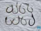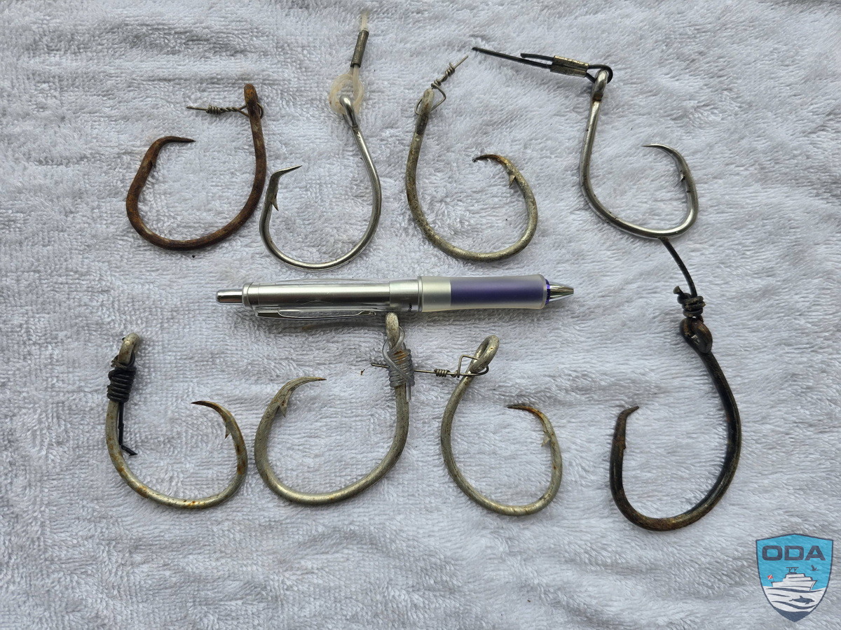 In that 5-poundlot were: 14 small hooks, 16 small J-hooks, 96 large J-hooks and 22 lures. For a total of 147 hooks. If you extrapolate that by 10, the total would be 1,470!