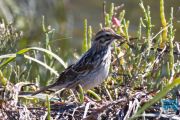 One specific bird we see there a lot is the Beldings Savanah Sparrow (see above pictures). They are a federal- and state-protected bird due to their diminished population numbers. But when I say “see them” that is a misnomer. They stay mostly in those plants and only venture out to grab something to eat nearby. Once they land in those plants, they are next to impossible to locate as they blend in with the background. I got this picture of a juvenile as it was out in the open for a moment.