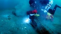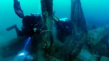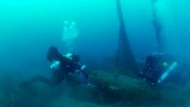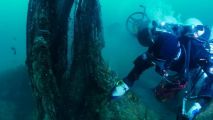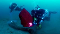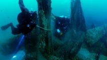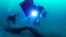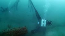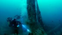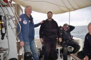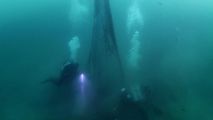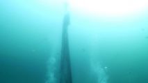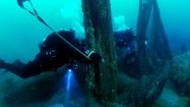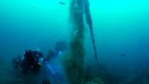 We dropped anchor in 90 feet of water. Al and Dave jumped in with their scooters, and proceeded to scour the area looking for the net. After about 20 minutes they sent a marker to the surface, signaling that they had found it. Kim, Jeff, and Walter jumped right in and scootered over to the surface marker; they dropped down to join them. We did this because it was the most efficient way to maximize everyone’s bottom time. Kim and Jeff are technical divers, and as such, they dive with twin tanks on their backs. This gives them about twice the amount of bottom time as a single tank, which is what Al, Dave, and Walter use.