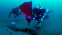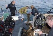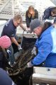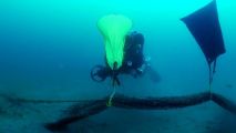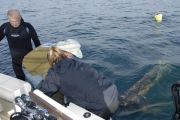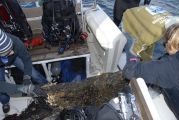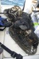 All in all, the two teams sent two sections of net to the surface using our lift bags. When we got all the divers back onboard, we motored over to the lift bags and started the process of hauling them on to our rear deck.