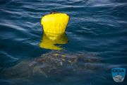 Then the float bags started popping up. When Jim and Sue saw that the divers were at least 50 feet away from the lift bags, they motored over near the bag and assessed whether the attached debris was light enough for them to haul on to their boat, or if it was a trap, they would attach a tow line to it and drag it over to Jeff and I on the LegaSea.