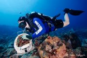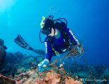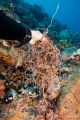The crew were all ecstatic at our chance to check out what they’ve been hearing about for a while now. Jacques and I entered the waters and grabbed onto a couple DPVs (Diver Propulsion Vehicles) to scout a wide area to be able to ascertain whether this was indeed the place we thought it to be. While we were searching, our captain held station and volunteers prepared their gear. It was a quick recon mission, as it became obvious very quickly where all the fishing line was. Jacques and I returned to the boat to brief Renee on this site and expectations. Renee was in town to document the work of Ocean Defenders to be featured in a future article on marine debris. There was no better place than Deep Step for her to make a photographic record of underwater destruction from ghost gear along with the ensuing massive and necessary cleanup. Her photographs are amazing! Please be sure to look in the photo gallery below to see them -- they all have her name in the lower right corner. Note: We’ll let you know when her article is published!