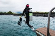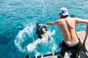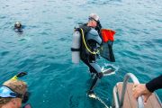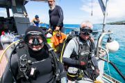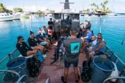 Before all the divers hit the water, everyone split up into teams of two or three, and agreed on which areas of the bay they would look for debris. Most headed for the rocks near the hotel, but one team headed to the far side of the bay since that they had underwater scooters to give them a greater range of distance from the boat.