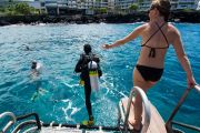 The site is called Keauhou Bay. Mantas are drawn to the area every night because the bright lights of a hotel that sits 30 feet from the water, draws in some of the critters that mantas can’t resist: plankton. At night there can be as many as 25 mantas feeding here for hours. Hundreds of snorkelers and scuba divers get to view the ritual each night.