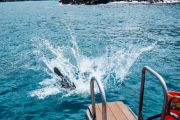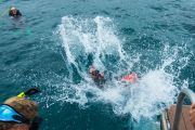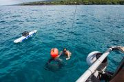 Meghan then headed down to attach it to the tire. A couple minutes later the lift bag was at the surface, and Alli began the long kick over to us on the boat. Something like 75 yards. No easy feat dragging a large truck tire that distance!