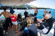 As he gave the divers a presentation on what to expect on the dive, he mentioned that he had seen manta rays here during the day because some reef fish had established a manta “cleaning station” here recently.