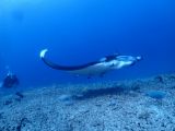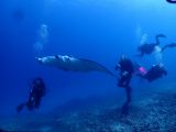 By this time, two groups had come together so everyone spread out to give the mantas space; we made sure we were far enough away to not spook them. The two mantas were soon joined by a third one. I couldn’t believe our luck and was just hoping that all the divers would behave themselves, not make any sudden moves that would spook the animals and drive them away.