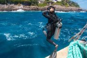 Next thing I knew, all 20 divers, were in their gear and ready to jump. Captain Joe pulled the boat up close to the cliffs, and the first team of 10 divers splashed and quickly descended to the bottom. In this case the bottom was just 25 feet below the surface—not too far! About five minutes later we dropped the other 10 divers off at the same spot.