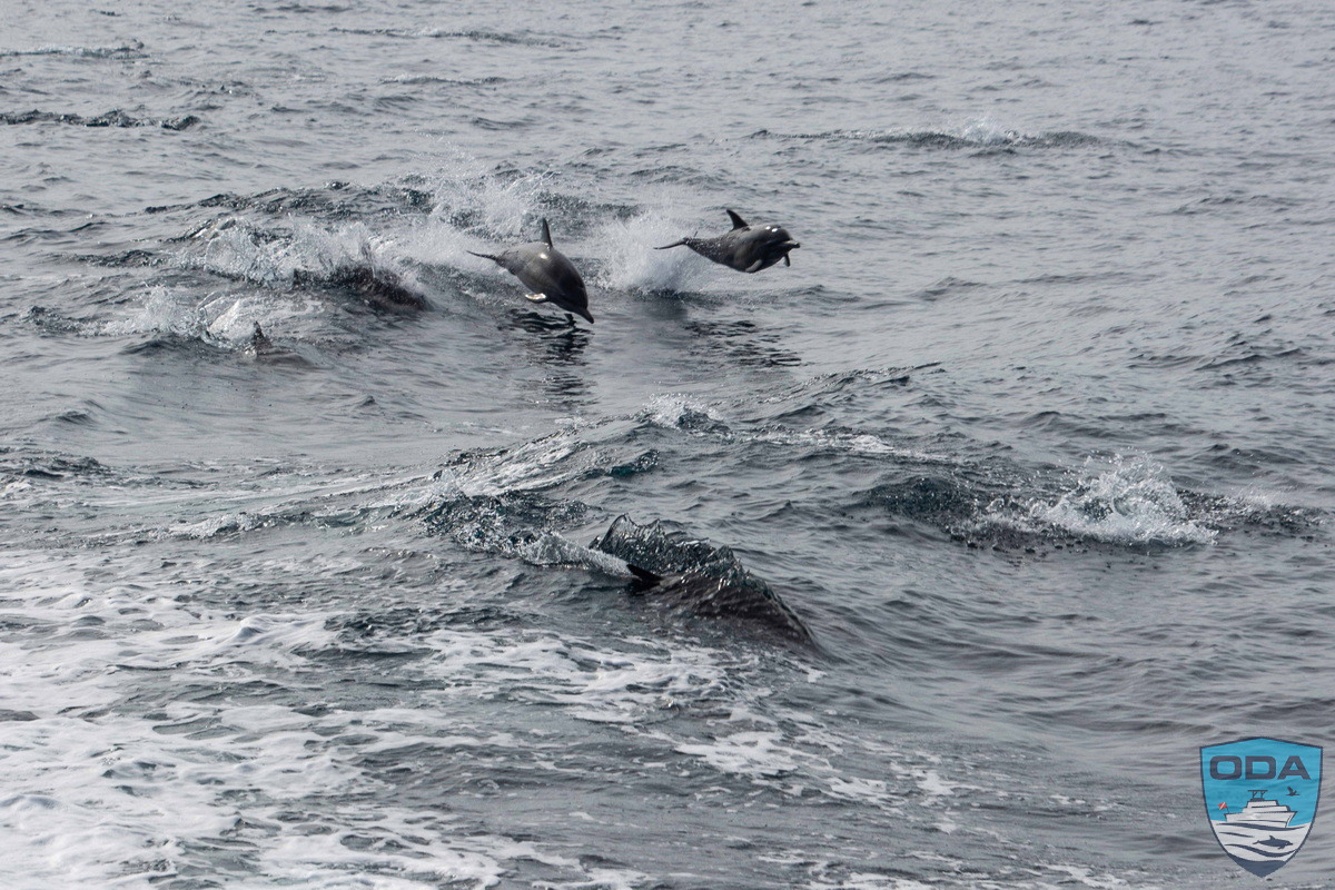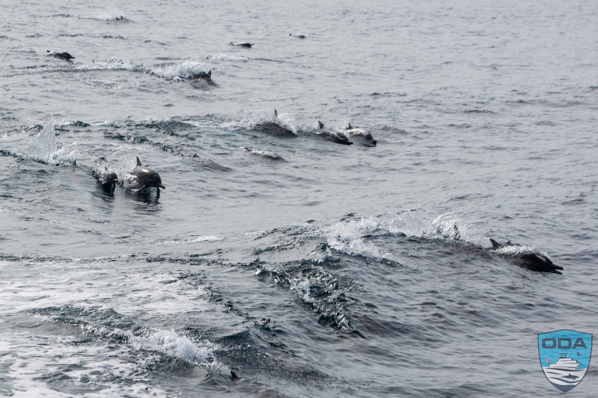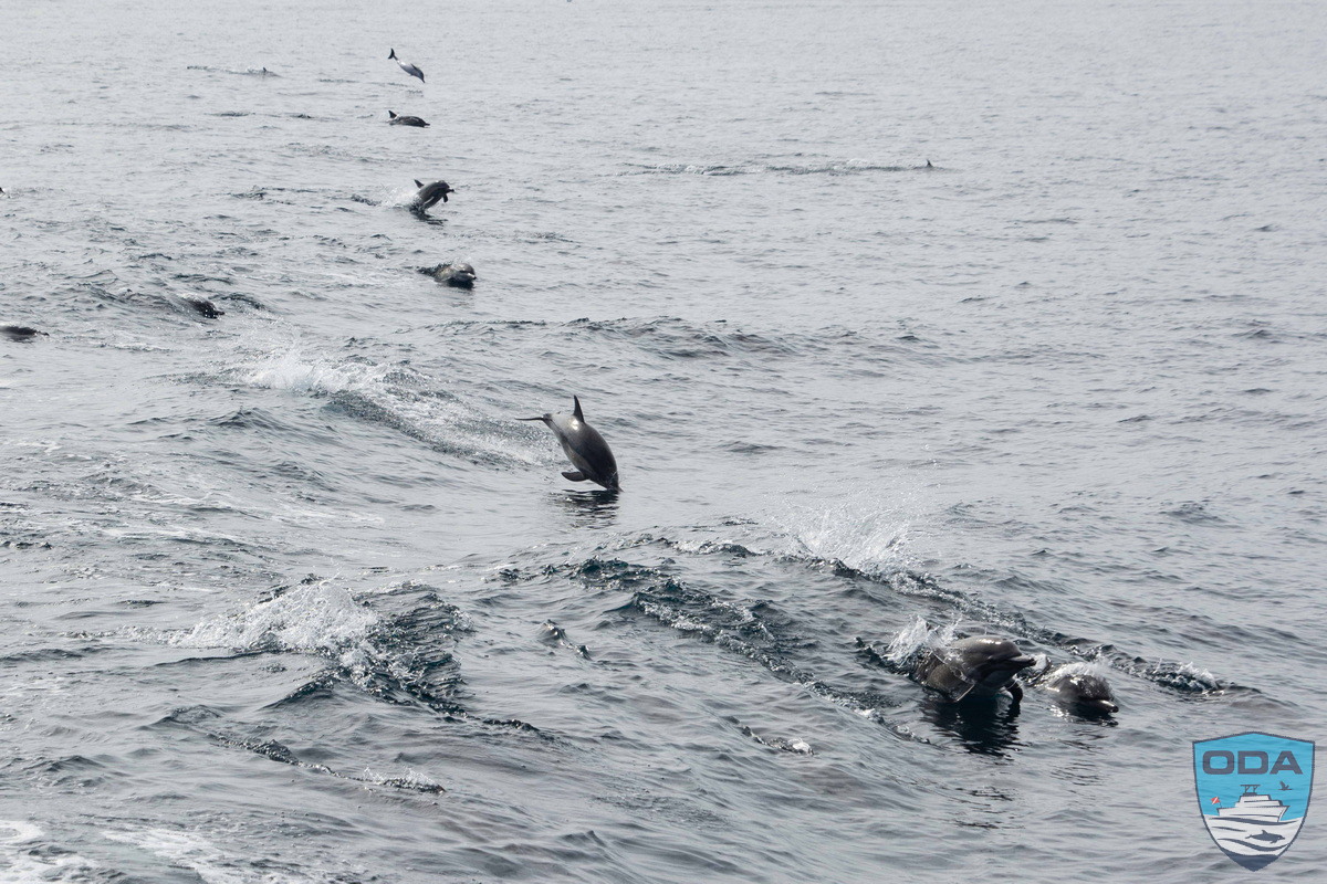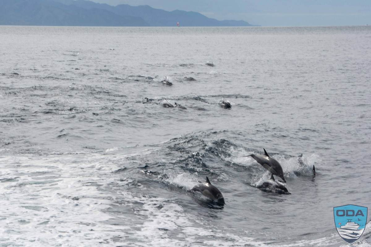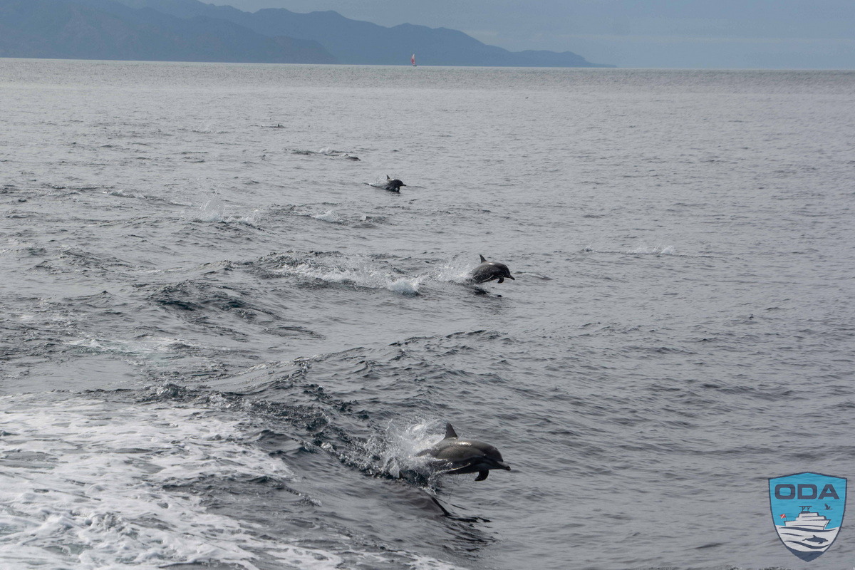 By this time, it was getting late, and we decided to head home. Along the return trip we encountered several more pods of dolphins. This time it felt like they were in play mode and joyfully rode our bow and were literally leaping out of the water in our wake. This lasted for at least 15 minutes.