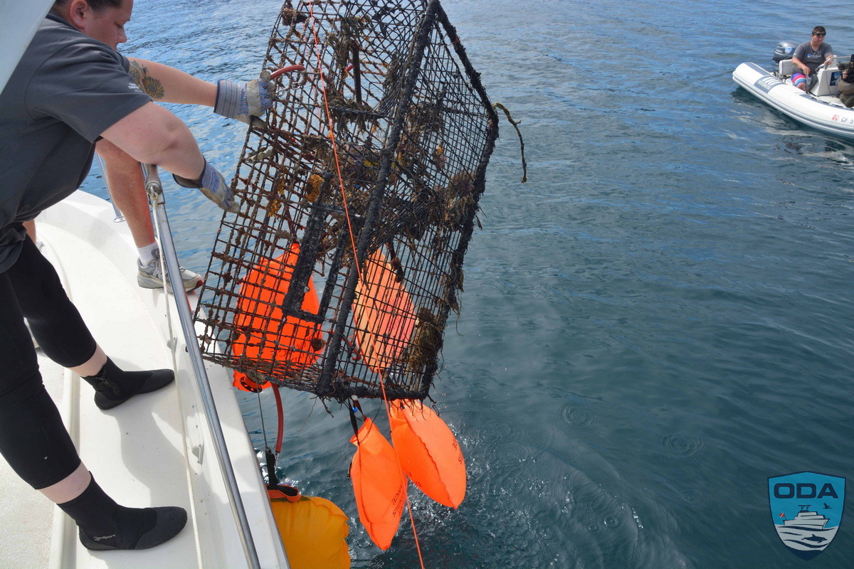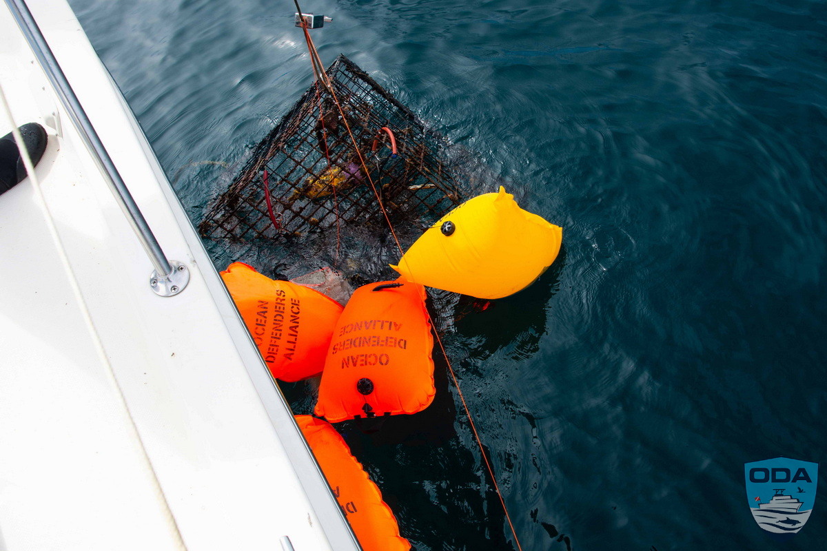 Fifteen minutes after they had dropped down, we saw 5 lift bags pop up. We usually only need 2 lift bags to raise a trap, but it turns out that this one was slightly buried in the sand and needed some extra “umph.”