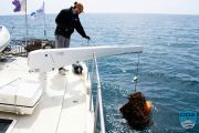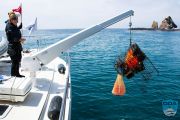 Because we were shorthanded on the boat, we couldn’t launch our smallboat that would normally be used to haul the trap back to the LegaSea. So, the divers used the power of their underwater dive propulsion scooters to haul it all the way back to us.It took them about 10 minutes to make that journey. Bart connected the trap to the hook on the end of the davit line (a crane onboard our boat), and up she came.