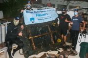 On December 30th, our Oahu boat partners Island Divers Hawaii, were returning their clients from a dive outing at a site near Hawaii Kai, on the south side of Oahu. Captain Tim Hollandsworth noticed something floating very low in the water and took a closer look. It was a large rectangular shaped object, about 6 feet by 8 feet. It had netting all over the top of it, and he could see a big line attached to it that was running down to the bottom.