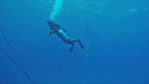 The dead coral heads were encased in a bunch of net, which was attached to netting that had been rolled up into a bundle and acted as a line. That line had stretched to about 90 feet up to the FAD platform.