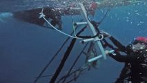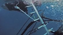Ed climbed onboard to help Tim wrestle sections of the FAD onto the rear deck as Glenn pulled it towards the stern. During this process, a lot of the line was getting caught in the propeller and the dive ladder.