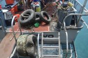 We headed back to the harbor and enacted our second cleanup plan: Look right under the boat slip in the harbor and see if there was anything down there to remove.