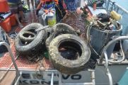 Into the harbor waters went Sheila, Jeremy, Megan, and Anthony. Matt and I stayed on the dock and dropped them some lines to attach to whatever they found. If they found debris, they would attach the line to it and give it a firm tug, so we’d know to hoist it up. And oh boy, did they find a lot.