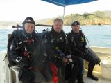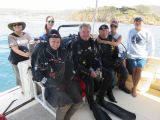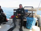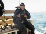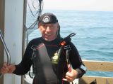 Rex dropped the anchor in 35 feet of water, and SCUBA divers Kim, Al, and Geoff grabbed their scooters and headed along the boundary line. After 45 minutes they came up with some trap lines and remnants, but there were no intact traps to haul out.
