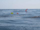 They dropped anchor in 40 feet of water, and soon Kim and Geoff were scooting around the area searching for our prey: abandoned lobster traps. Al cut his hand on something and had to call it quits for this dive. Within 10 minutes the first set of lift bags broke the surface. Five minutes later and 40 feet away from the first bags, two more lift bags were spotted. Another few minutes and the pattern repeated.