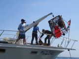 When Kim and Al got safely back onboard the LegaSea, the RIB crew started hauling the traps over to the to the boat where the ODA Boat Crew used our crane (davit) to haul the abandoned fishing gear onto the front deck.