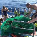 Thinking and hoping it was a whale shark, they slowly motored over to it, only to be surprised to see that is was a huge net—it was whale-shark size and even had the same shape! The crew quickly shifted into “ODA mode” and started to figure out how to haul it on to the boat. Their ocean-loving customers were eager to help remove the mess and get it out of the water!