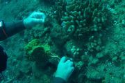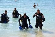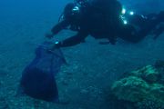 Much of the debris was located near the far end of the bay where it opens out to the ocean, an area where strong water flow often funnels lost fishing gear into the reef. Right from the descent, it was clear this zone was holding a significant amount of discarded fishing line. The divers spread out along the reef contours, relying on line cutters and shears to carefully free monofilament from coral heads without causing damage. This was delicate, slow work—each cut had to be precise, and each section of line had to be lifted away without breaking fragile coral branches.