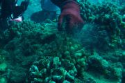 Over the course of the operation, the team removed fishing line, much of it deeply embedded and entangled around living coral. Divers also discovered a substantial section of derelict fishing net—approximately 60 square feet—lodged on the reef. Working together, the team gradually rolled, folded, and extracted it, surfacing with a water-logged bundle.