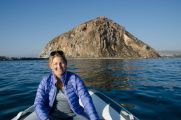 When Kim and I were in Morro Bay a few days earlier, we put the boat in the water and motored around to make sure the boat was functioning properly. Here is Kim when we first set out. Notice the relaxed smile...