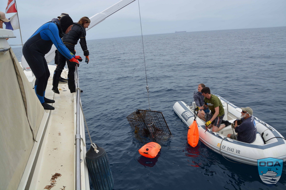 Within minutes of them hitting the bottom, we saw lift bags break the surface. Within 15 minutes there were two more sets of bags that had popped up. Eric, Tim, and David quickly got in the RIB and started the laborious process of attaching a tow line onto the trap and then hauling it over to the LegaSea where we hooked the davit line onto the trap.