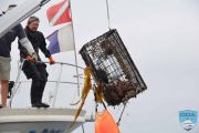 Once all that fun was over, Craig climbed back aboard, and we all took a lunch break. Then we found out about how epic this dive was. The underwater (UW) vis was like the tropics, at 50 to 70 feet. Once they all got down to the anchor resting on the bottom, they immediately saw three traps. Kim worked on hooking lift bags up to one trap, while Geoff worked on another one, and Craig did the same to the third one.