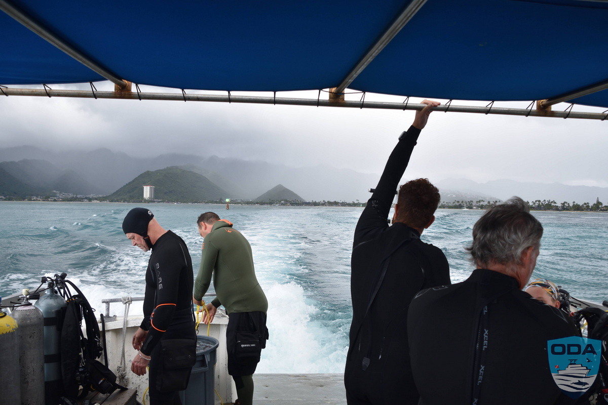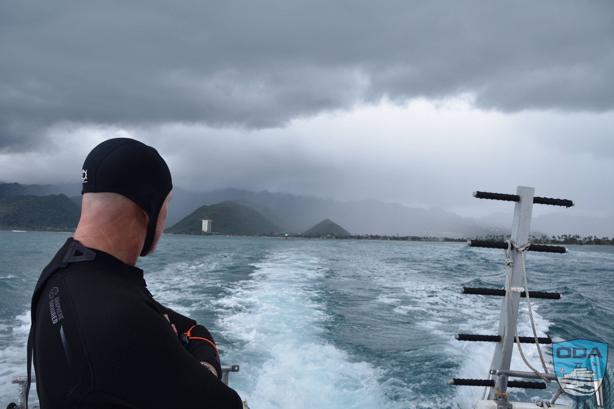 On the afternoon of February 22 at 2:00 PM, we launched with our sights initially set on Fish Camp in Maunalua Bay. The weather already looked a little questionable. Dark storm clouds were building onshore and rain was sweeping across the mountains. Looking back toward the Koʻolau Mountains, we could barely see the ridgeline through the heavy clouds and rain bands. It was clear the weather was moving in, but we were determined to get a dive in before the storm arrived.