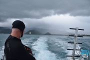 In one of those perfectly timed moments that only seem to happen on dive days, the skies briefly cleared about a minute before the divers surfaced. The sun popped out just long enough for us to safely get everyone — and the debris — back onto the boat before the storm opened up again.