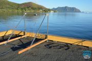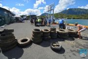 Now we put Ed’s new system to the test. In times past getting these huge tires onto the dock was really really difficult. Not only were they heavy, in the 200-to-400-pound range, but once they were hauled to the edge of the pier, we had to get them over a 90-degree bend.