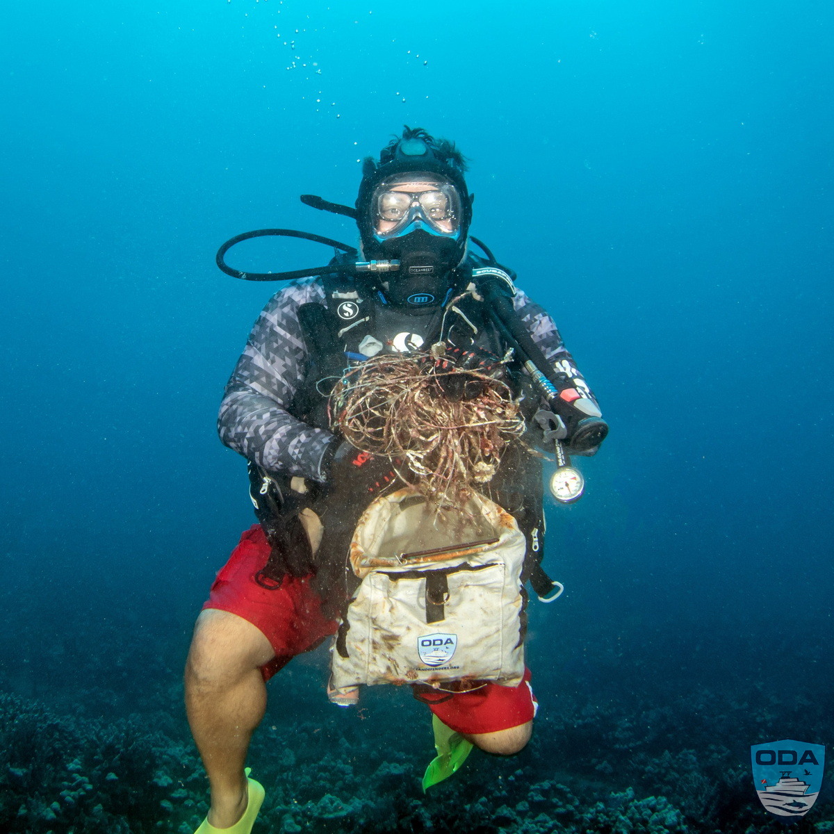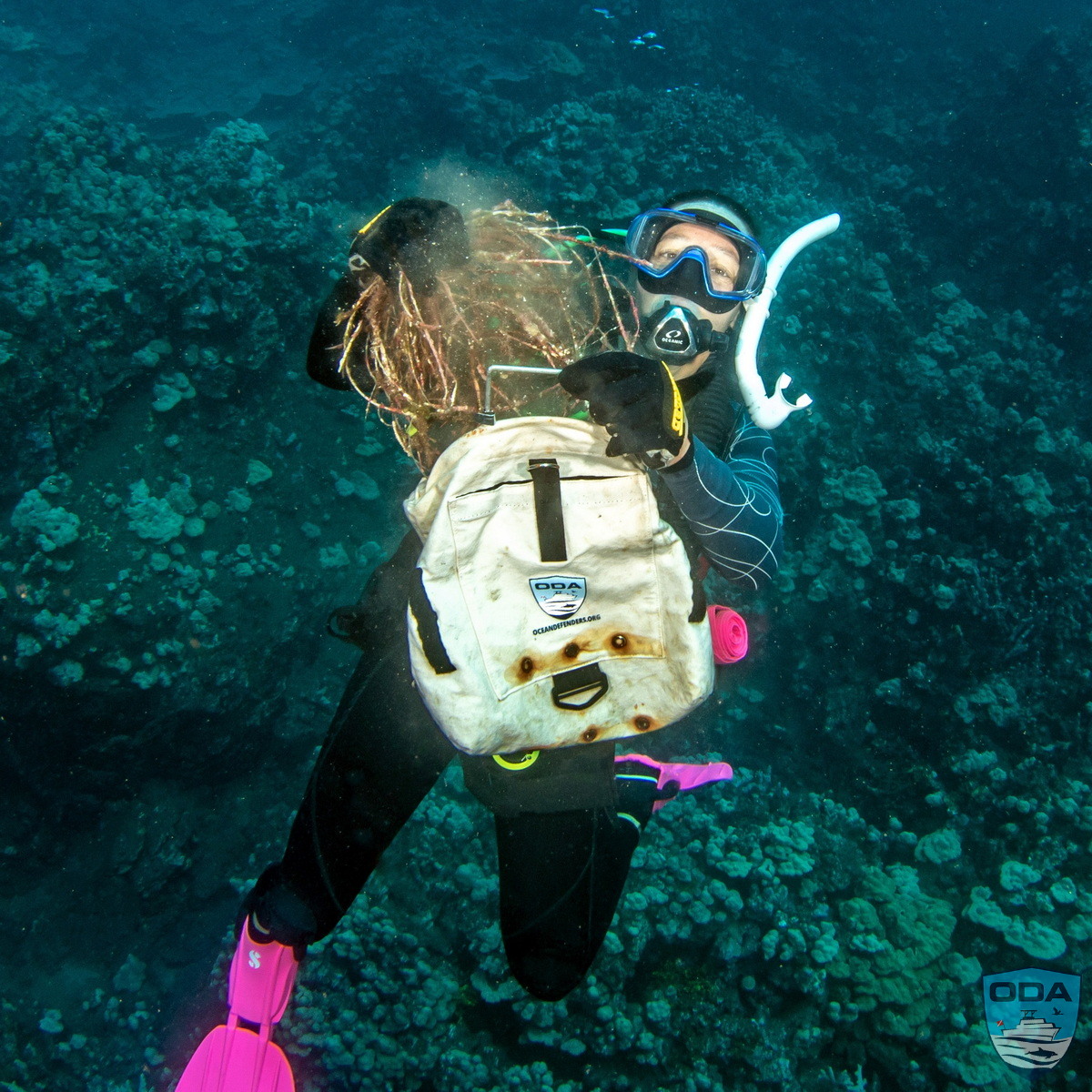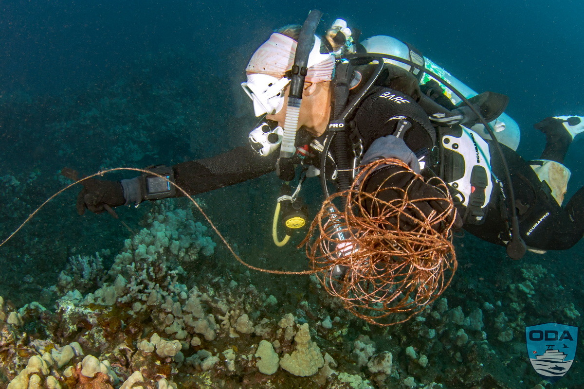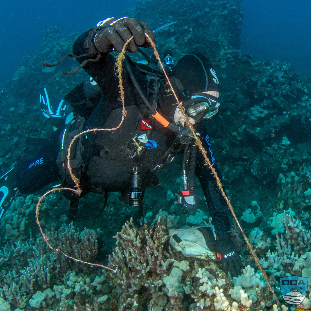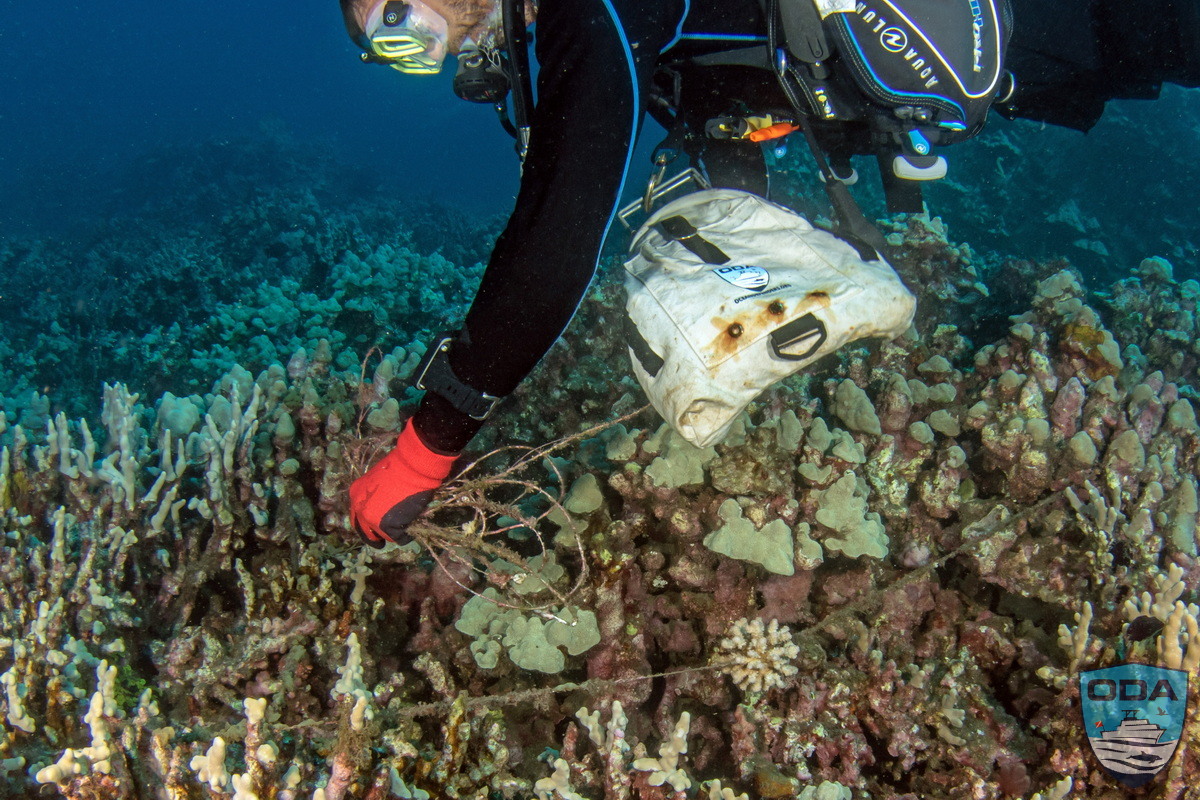 Twice a year, Kohala Divers with ODA's Big Island Northern Coordinator Kay Cooper take an advanced cleanup charter along the Northern Coast of the Big Island to clean hard-to-get-to areas of the coastline that are frequently fished from shore by local fisherman. This coastline is known for strong currents, large swell, and high winds, which makes it difficult to reach by boat. Most of the moorings along this coastline (8 in total), are not exactly where the fisherman like to fish from, which requires our cleanup divers to go for a long surface swim or a shallow under water swim before reaching the debris.