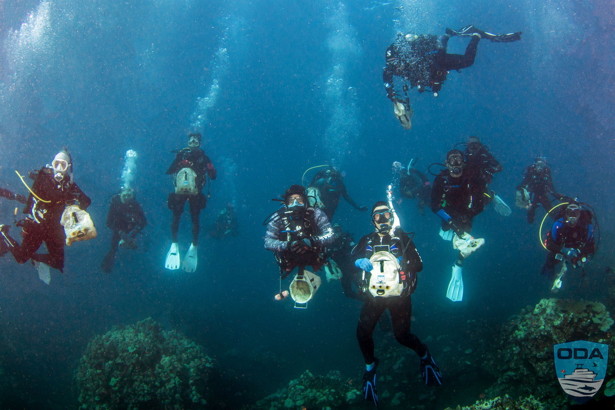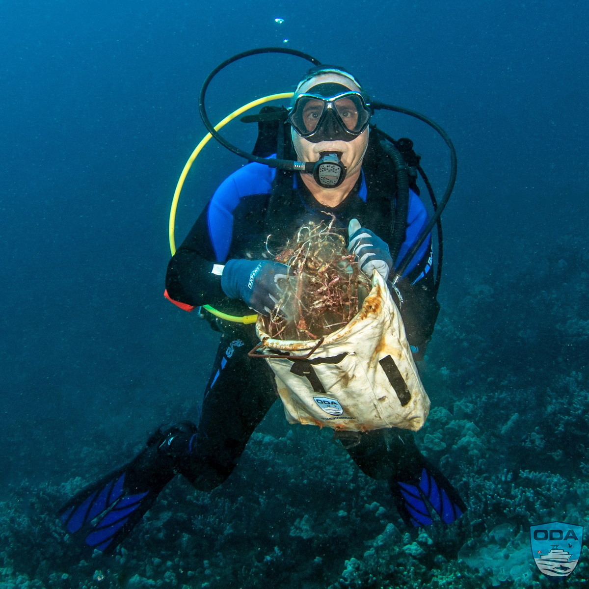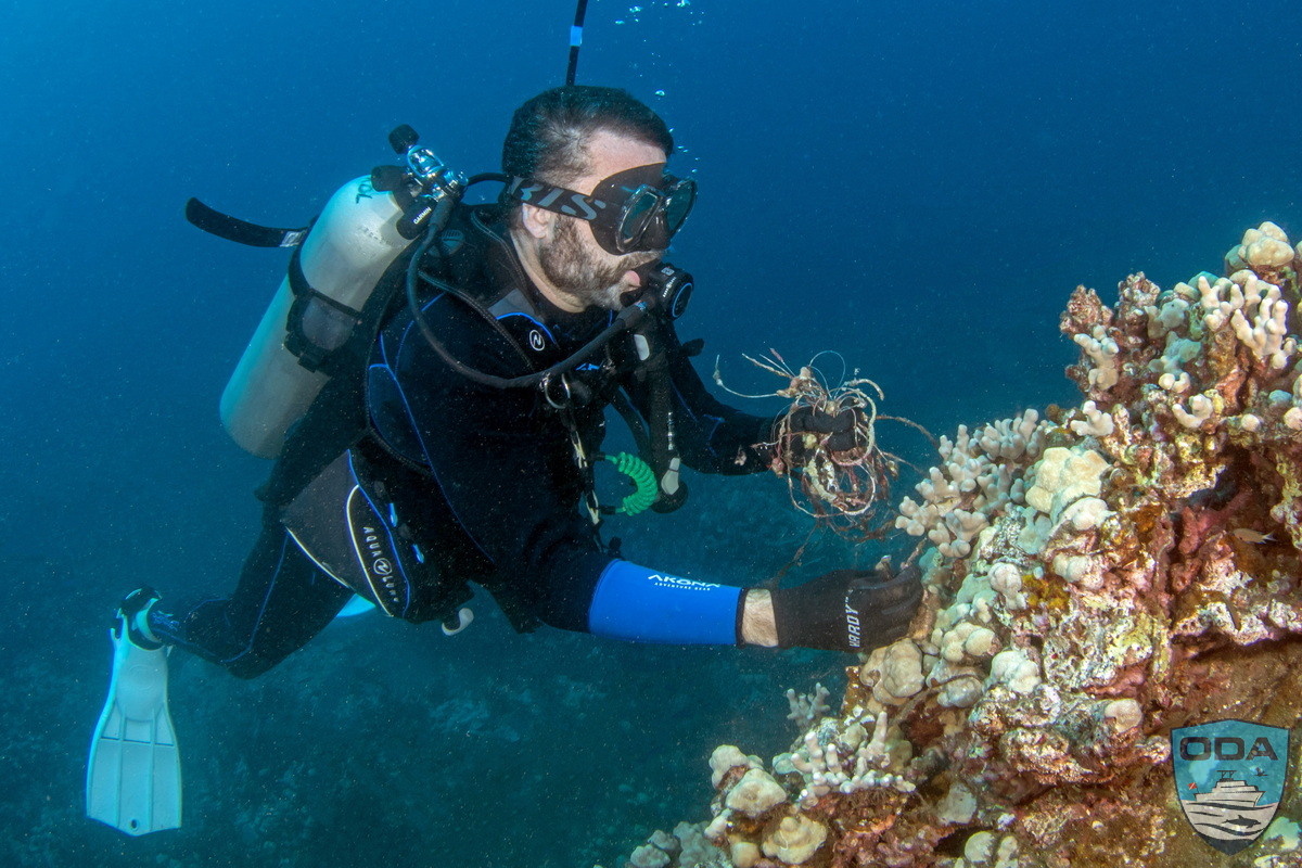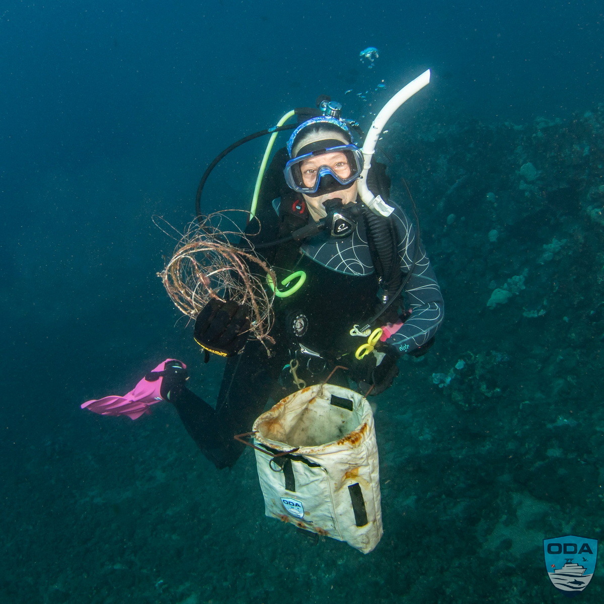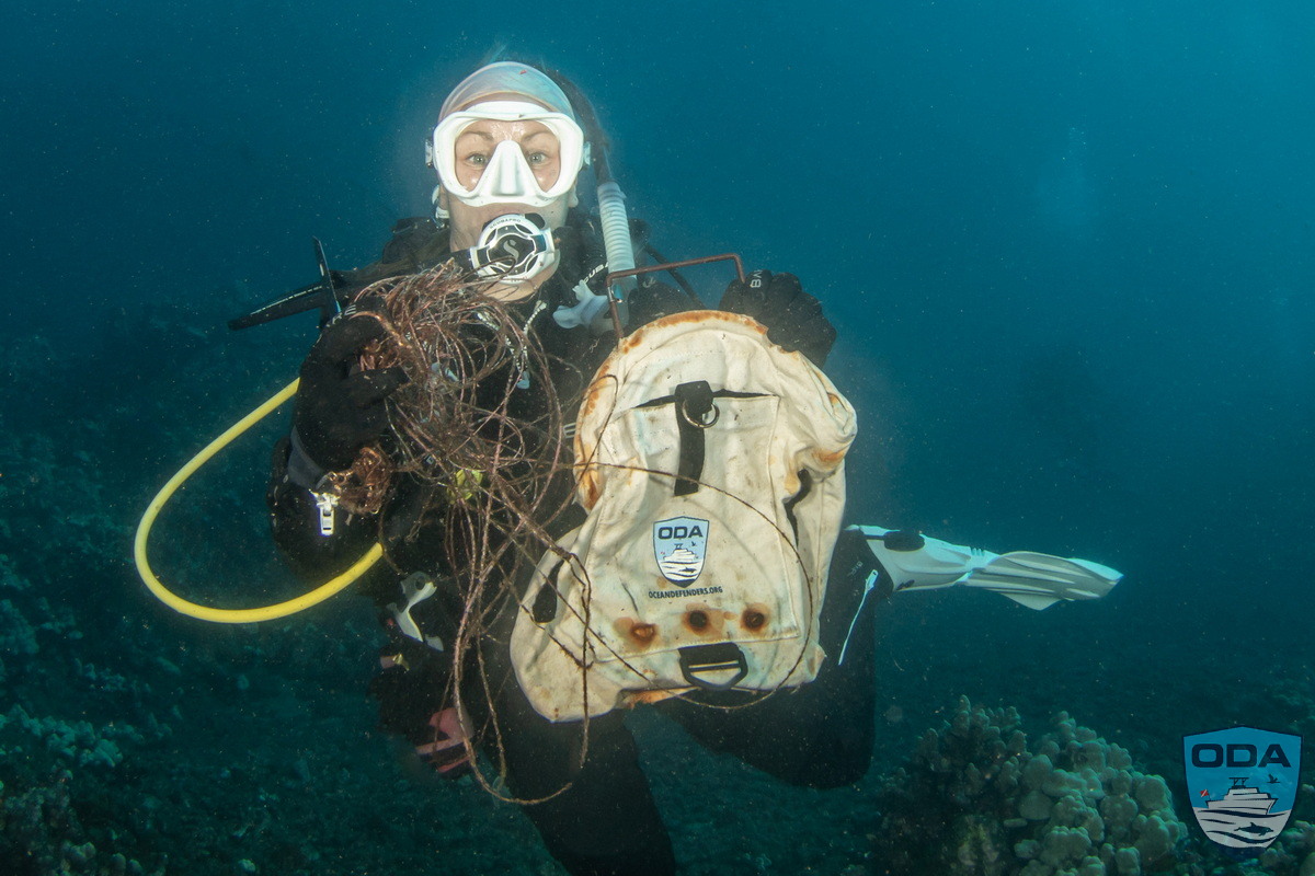 Twice a year, Kohala Divers with ODA's Big Island Northern Coordinator Kay Cooper take an advanced cleanup charter along the Northern Coast of the Big Island to clean hard-to-get-to areas of the coastline that are frequently fished from shore by local fisherman. This coastline is known for strong currents, large swell, and high winds, which makes it difficult to reach by boat. Most of the moorings along this coastline (8 in total), are not exactly where the fisherman like to fish from, which requires our cleanup divers to go for a long surface swim or a shallow under water swim before reaching the debris.