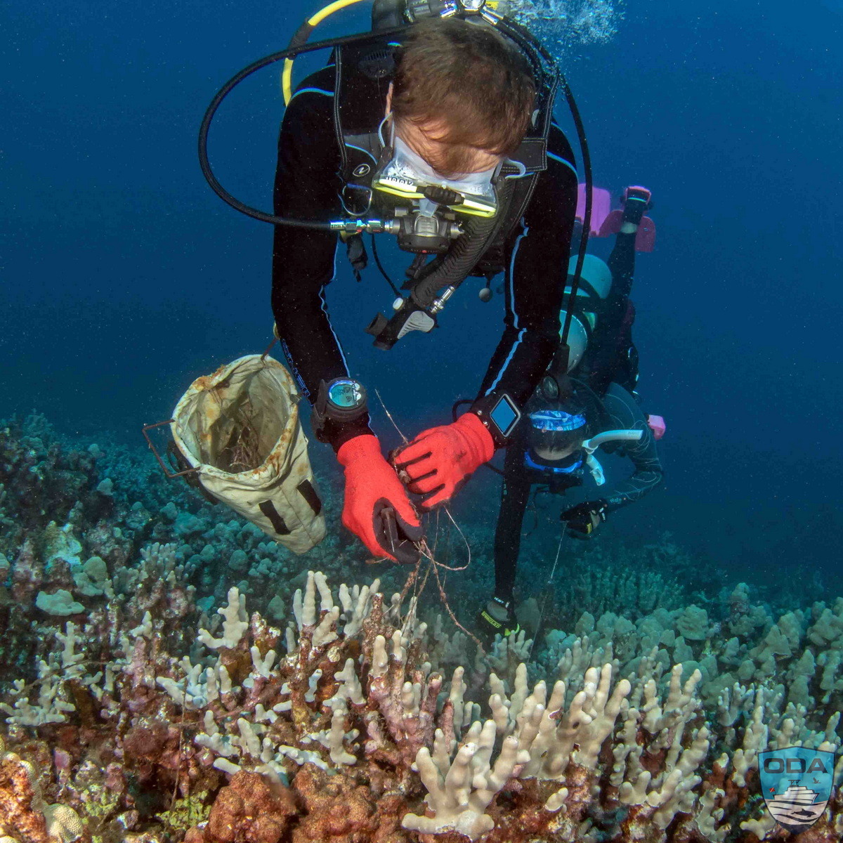 With a 1-hour surface interval (break) and another briefing, our divers suited up again and began to drop in the water. I stayed on the boat this time as 1 staff member with captain have to be on the boat at all times, and our other Kohala Divers staff member, Jezza Evans, joined the team. Once all divers were in the water, we pulled the boat away, back toward blue water while our divers began their work! A couple of divers stayed deeper to work on the line there, while the rest of the team stayed shallow, trying to get the hard-to-reach line from the corals. This is very long, thick line going for the larger fish, so it can really end up deep, over 100 feet. Our deeper divers stayed above 70 feet as this was the second dive and there was plenty of work to do at this depth.