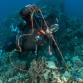Our dedicated team quickly began to work. With good buoyancy, gloves, cutting tools, and rubbish bags in hand, we began to carefully remove line from around corals, in between rocks, off the floor, and out of holes. Our bags started to fill fast with thick fishing line and older line that had been down there for a long time. Some of the line went on and on, one leading me from 30 feet to around 60 feet until I finally found the end of it that had a large ulua hook on the end of it. With the line being so scattered, it’s very important for all our volunteers to look up and around them to ensure they stay with the group, monitor their depth, and most importantly, keep track of their air. This work is very meticulous and can easily keep you distracted long enough to lose track of your team and air. Since this was a live-boat cleanup, when the first person reached 1,000 PSI in their tank, we all gathered together, and came up to do our 3-minute safety stop as a group.