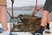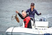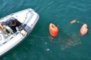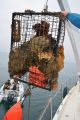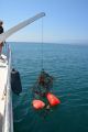 The RIB (rigid inflatable boat) team quickly headed over to the bags and got to work. Sue was handling the boat, while Billy hooked a tow line up to the trap. Pete was filming all the action as Sue towed the trap back to us on the LegaSea.
