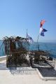 We anchored about 100 yards away from the “island.” I put that in quotes because it’s an artificial island. It was created by an oil company that used it to transfer oil from the pipelines that are connected to the oil rigs off the coast. The island was de-commissioned a few years ago and it no longer has any commercial activities happening there.