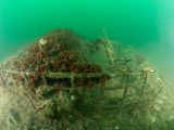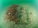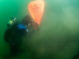 Erich, Al, Kendall, Maureen, and Geoff jumped in the tranquil waters and grabbed their bags stuffed with lift bags, as well as their scooters. They headed the short distance to the structure and dropped down to the bottom at 30 feet.
