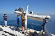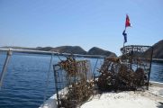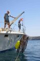 What was confusing to me was that the bags were far apart. Jim, Karla, and Tim got in the RIB and cautiously motored over to the first set of lift bags, making sure they were nowhere near the divers. Jim radioed me that there was a huge trap attached to it.