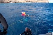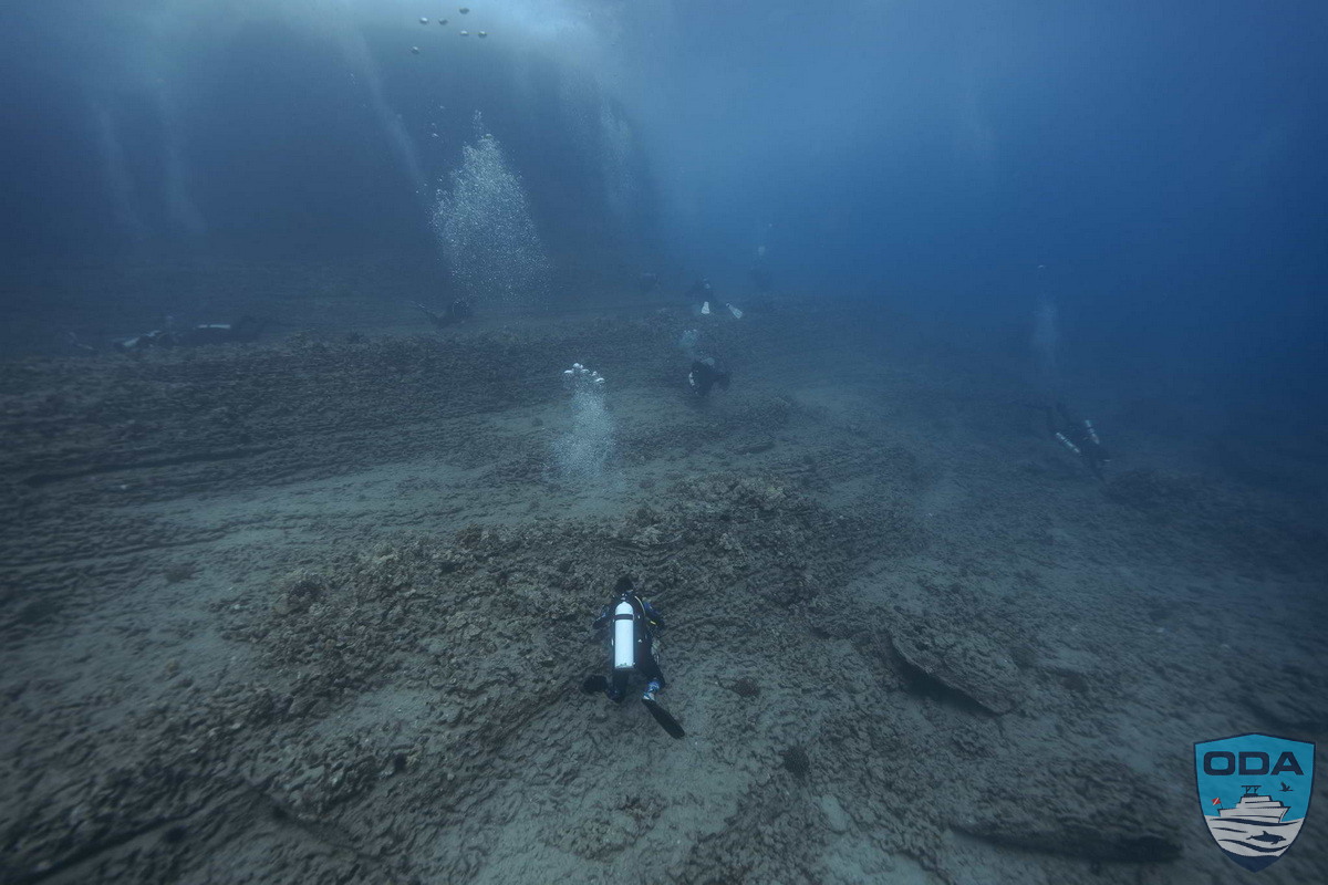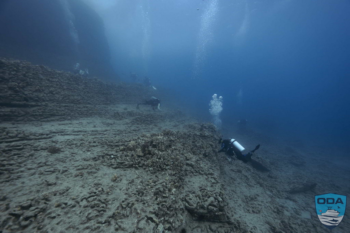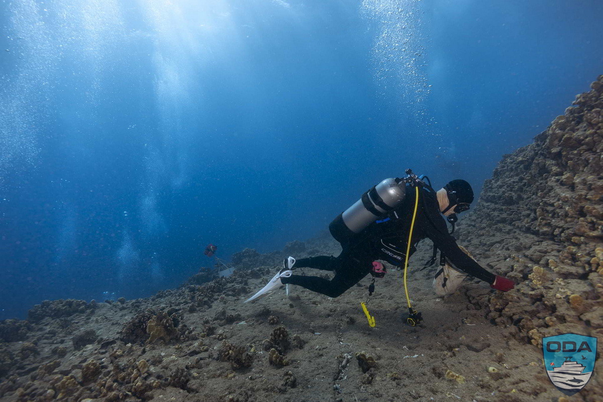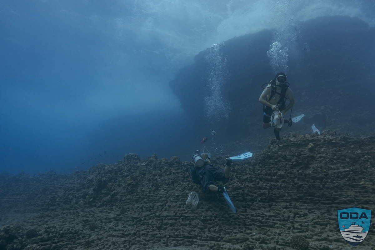 We were honored to have ODA Founder Kurt Lieber join the crew as topside support, alongside Temple Liebmann and Kassandra Leclair, making for a full and energized team ready for the day’s mission. Our plan was to begin at Fish Camp, but as we approached, the ocean made its mood unmistakably clear. The site was churning in “washing-machine” conditions—crossing swells, steep chop, and unpredictable waves—making it unsafe for diving. After a careful evaluation, we shifted course and headed toward Spitting Caves, where the conditions, while still lively, were far more diveable.