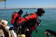 After about 15 minutes we saw them pop up at the surface about 300 yards away from where we were anchored at. They got their bearings, dropped down again and headed to the break wall. They then swam the entire length of the break wall. When they got to the end of it we finally saw 2 lift bags break the surface. Excellent!