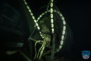 We knew that the wreck had been sliding down a steep slope and was now in much deeper water. NOT safe depths for your average diver. But Mike and Craig use rebreather systems which allow them to go deep and do it safely. Kim and Geoff were to hang out at the 60-foot mark and assist them if they needed any help.