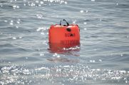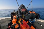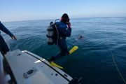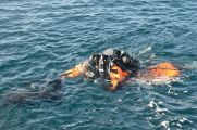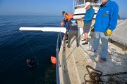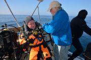 As soon as the divers were out of their gear, we motored the boat to where the lift bags were, about a half mile away. I pulled the boat up alongside one of the lift bags and Erich jumped in the water to attach the hoist line from the davit (crane) so we could haul it aboard.