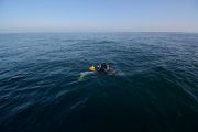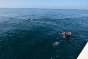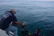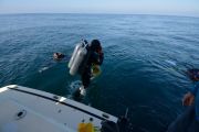 As the divers were getting into their dive gear, we couldn’t help but notice a strong current blowing by our boat. So, we threw out a drift line behind the boat that divers could grab onto, in case they couldn’t overcome the current and potentially drift away.