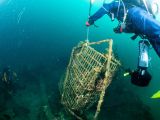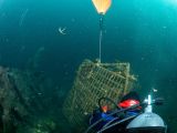 Just as he got the trap freed from the pile on top of it, the other divers showed up and started attaching lift bags to it. Soon it was on its way to the surface. Erich did his usual outstanding job of getting some great pictures and video of the scene.